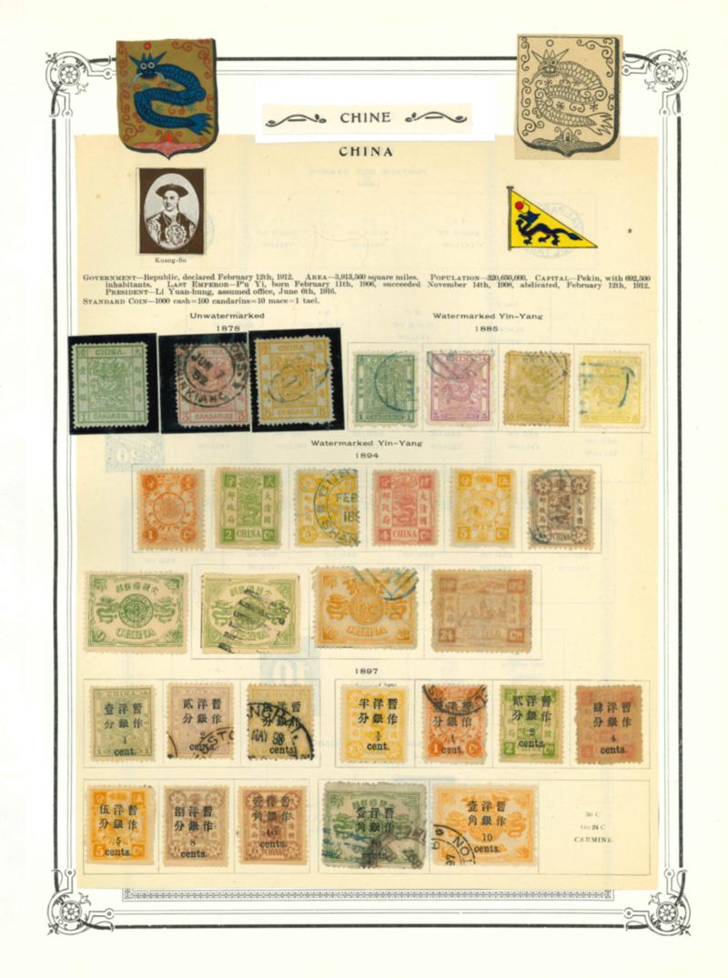 1878-1939 collection in Timbres-Poste printed album with early issues used including 1878-83 Large Dragon 1ca, plus 3ca and 5ca (perf faults), 1885-88 Small Dragons 1ca, 3ca and 5ca, with 1894 Birthday set to 24ca. A range of 1897 surcharges mint and used to 10c, with 1897 Red Revenues surcharged 1c on 3c, 2c on 3c (both types) mint, 4c on 3c unused, 1898 Imperial Chinese Post mostly used to $1 ($5 unused) and Chinese Imperial Post to $2 used. From 1912 onwards we note the Republic $1 mint, 1923 definitives to $20 used, 1928 Assumption set mint, 1932 Expedition set used, then Postage Dues with 1904 opt set mint and set to 30c used. A fine section from the various Provinces follows, mostly mint, with Manchuria including the 1928/9 sets, Szechwan 1933/4 complete, Sinkiang with 1915/16 to $1, 1928 set, 1929 Unification and 1933 Memorial sets, Yunan with 1929, 1933 Memorial and Martyrs sets. Thereafter, Japanese Pos mostly used (1900 Wedding mint) and Russian POs, a very useful range of around 140 from Shanghai with 1866 12ca mint then a fine assembly of mint, some used, surcharges, perf types etc. Finally, Manchukuo with plenty of decent mint issues (1936 to 1y etc). A superb collection. (Image)