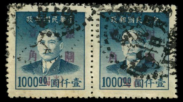 1949, Silver Yuan, Tsingtao surcharge on Dr. Sun Yat-sen, 10¢ on $1,000 blue (Scott 4), pair, Extremely Fine. Chan S202. Scott $180. (Image)