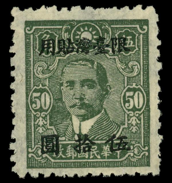1948, "Limited for Use in Taiwan" surcharge on Dr. Sun Yat-sen, Central Trust printing, $50 on 50¢ green, perf 11 (Scott 99a), without gum as issued, Very Fine. Chan TP43aii. Scott $50. (Image)