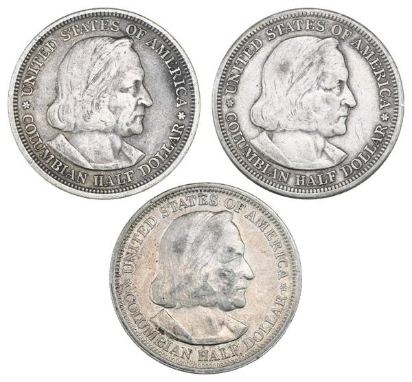 1893 Columbian Exposition Half Dollar Assortment, features three half dollars, ranging from good to almost uncirculated condition. (Image)