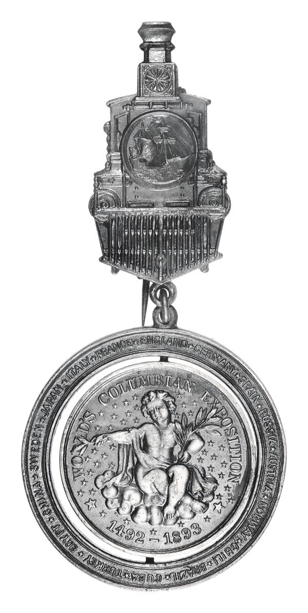 1893 Columbian Exposition Commemorative Pin Medallion, features a spinning medallion in the center of the medal connected to a pin piece depicting a train with ships in the center; a very unusual, attractive, and seldom-seen piece. (Image)