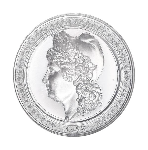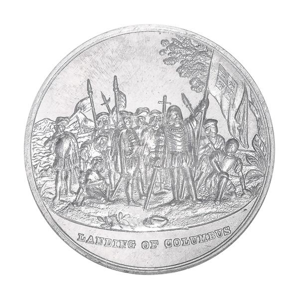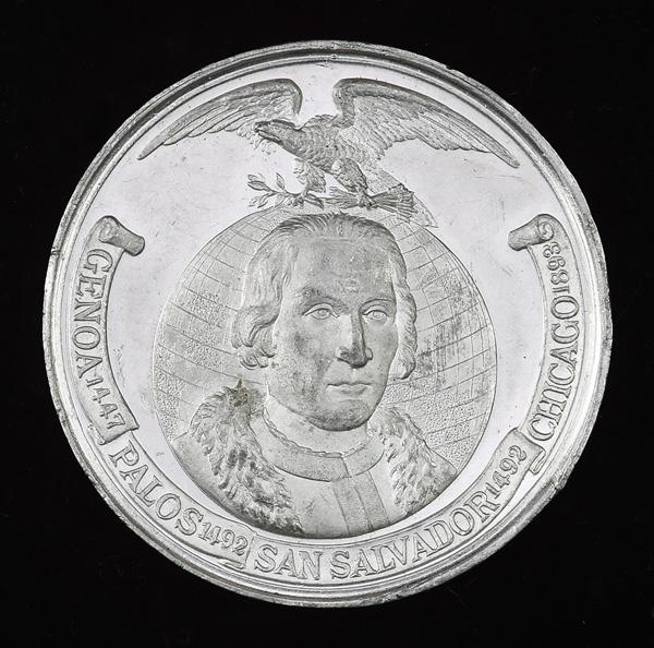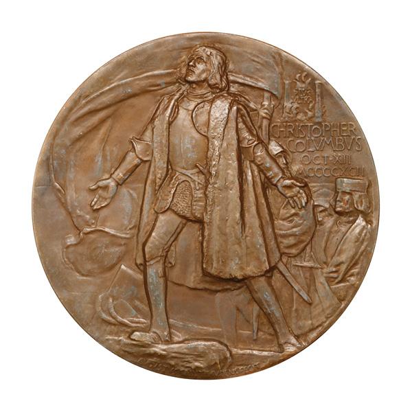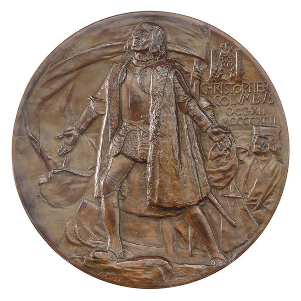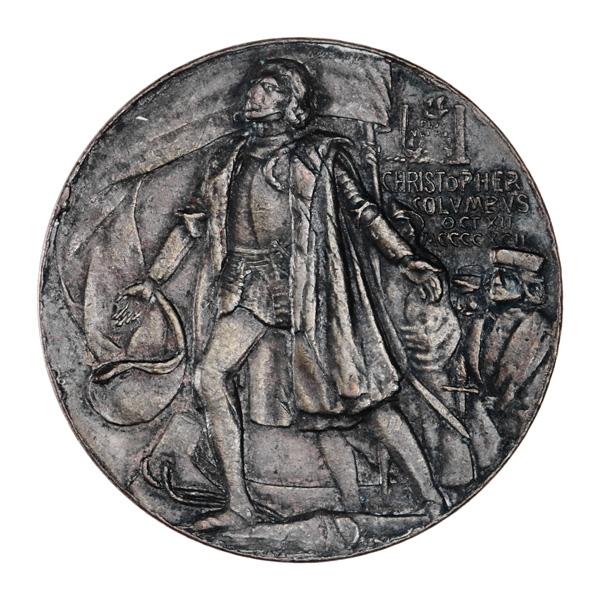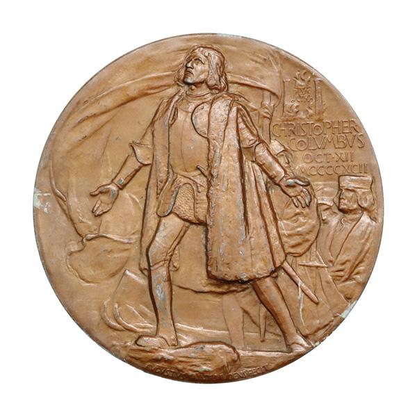 1893 Columbian Exposition Medal by Augustus Saint-Gaudens & Charles Barber, depicting Christopher Columbus as he sets foot in the New World; fine detail with some light oxidation; please see complete photos online. Shipping charges apply - weight 1 lbs. (Image)