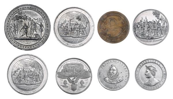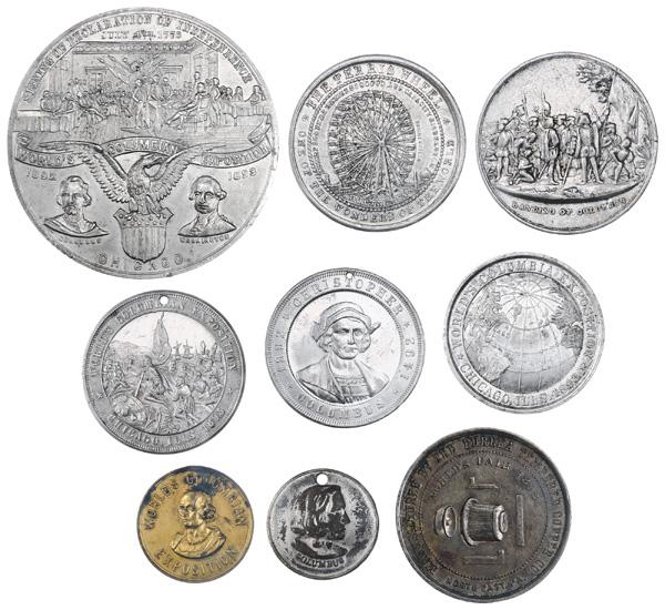 Group of (8) 1892-93 Christopher Columbus Columbian Exposition Medals, a variety of medals in varying condition, with some fine to very fine examples, all featuring Christopher Columbus in some form; includes Declaration of Independence / Columbus' Landing medal, Jackson's Soda Landing of Columbus medal, Administration Building / Landing of Columbus medal, one copper Machinery Hall medal, Illinois Pure Aluminum Co. souvenir medal, and others; an impressive assortment (8). (Image)