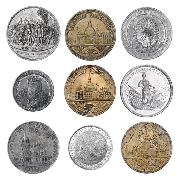 Group of (9) 1892-93 Columbian Exposition Medals: U.S. Government Building & Others, a very attractive assortment; features three U.S. Government Building medals in good to fine condition, one "aluminum extracted by electricity from common clay" medal, one Landing of Columbus "Facts About Chicago" medal, one Irish Village medal, one America's Trinity of Heroes medal, one Indiana Building medal, and one Ferris Wheel medal; condition varies among these medals, please see full photos online (9). (Image)