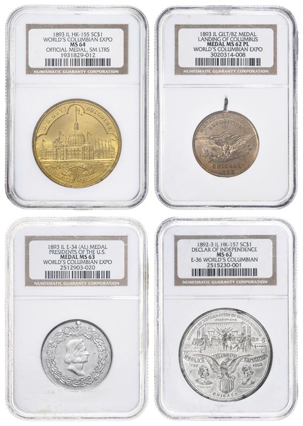 Group of (4) 1892-93 Columbian Exposition NGC Graded Medals, features (all NGC graded and slabbed): 1892-3 $1 Declaration of Independence World's Columbian Medal MS62 IL HK157, 1893 bronze Landing of Columbus medal MS62 IL, 1893 Presidents of the U.S. medal IL E-24 (AL) MS63, 1893 $1 World's Columbian Exposition Official U.S. Government Building medal IL HK-155 MS64; a very fine an impressive grouping (4). Shipping charges apply - weight 0.6 lbs. (Image)