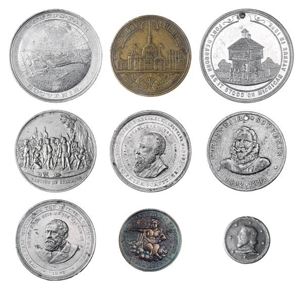 Group of (9) 1892-93 Columbian Exposition Commemorative & Souvenir Medals, a variety of medals in varying condition, with some fine to very fine examples; features items such as: Fort Dearborn medal, Cyrus Hall McCormick medal, U.S. Government Building medal, Columbus Buggy Co. advertising medal, "Facts About Chicago" or Columbus' Landing medal, the Pioneer Wagon Works medal, and others; a very attractive group with many better advertising medals (9). (Image)