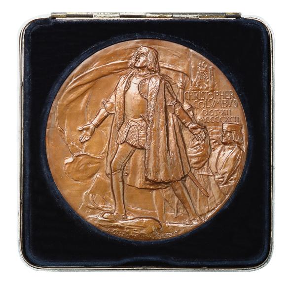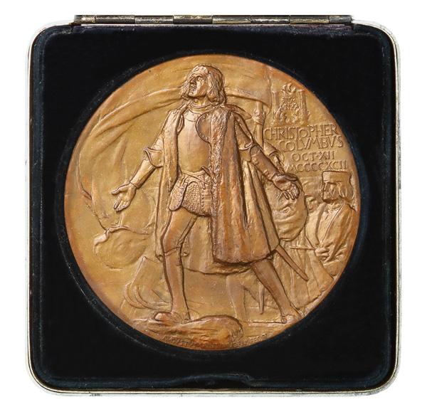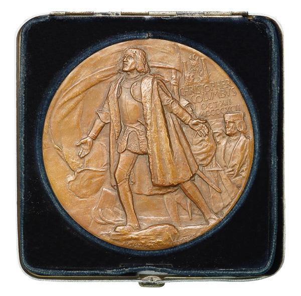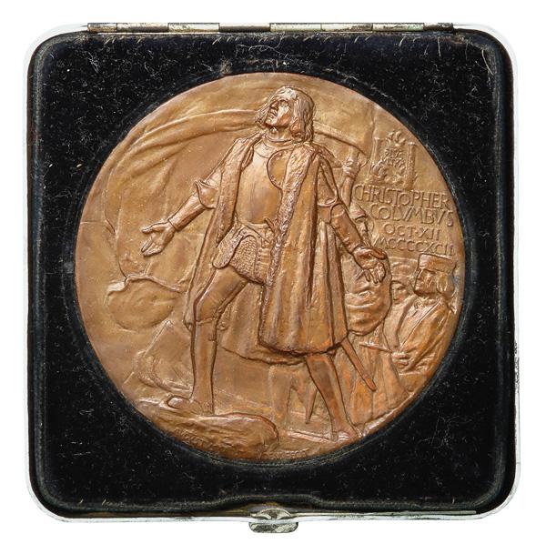 1893 Columbian Exposition Medal by Augustus Saint-Gaudens & Charles Barber, in original case; a superb and clean example depicting Christopher Columbus as he sets foot in the New World; absolutely outstanding detail, a magnificent example that appears to have been seldom handled since it was originally produced; measures 3". Shipping charges apply - weight 0.8 lbs. (Image)