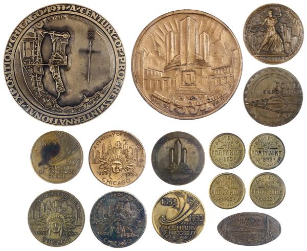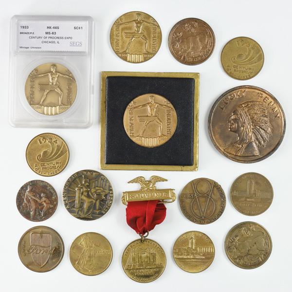 Group of (15) 1933-34 Chicago World's Fair Century of Progress Medals, a wide variety of medals; includes a Walgreen Drugs medal, Days of Forty Nine tokens (4), a Mostra Italia medal, and various advertising medals; additionally includes a pressed token depicting the Fairgrounds; an attractive assortment (15). Shipping charges apply - weight 1 lbs. (Image)