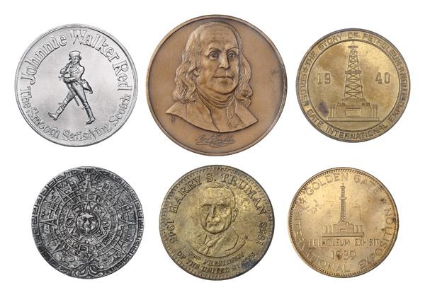 Group of (6) Advertising & Exhibition Medals, 1892-1980, features two Petroleum Exhibit medal from the Golden Gate International Exhibit of 1939-40, a World's Columbian Exposition Aztec Stone Calendar medal, a Harry S. Truman medal, a Johnnie Walker red advertising token, and a Franklin Mint Benjamin Franklin medal (6). (Image)