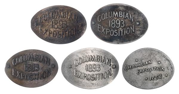 Group of (5) 1890-92 Columbian Exposition Pressed Souvenir Tokens, an impressive variety; includes: 1890 Indian Head Penny, 1890 Liberty Nickel, 1891 Liberty Nickel, 1892 Indian Head Penny, and unidentified Liberty Nickel; a very attractive assortment (5). (Image)