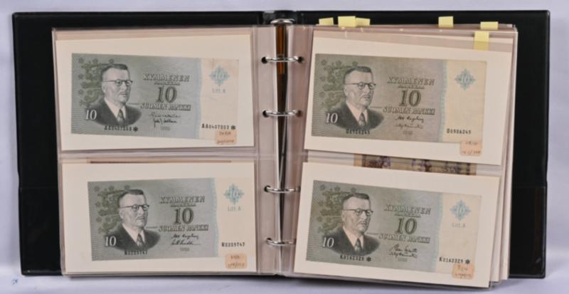 1909 - 1986 small selection of 1 markka - 100 markka banknotes in album, total of 50 pieces. A few banknotes with stars (1963 50 markka Litt.B kl. 1+), 1963 100 markka two copies etc. Mixed condition (Image)