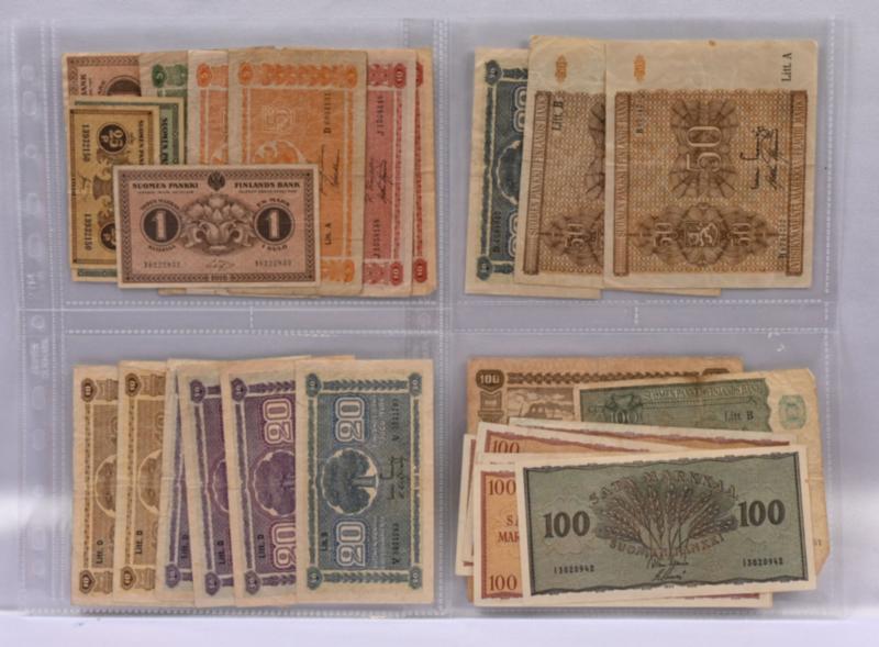 Selection of Finnish banknotes from Independece period. Total of over 40 banknotes 25 penni - 100 markka. Mixed condition 01/2 / AU-G. Including eg. 50 markka 1945 Litt.A and Litt.B (Image)