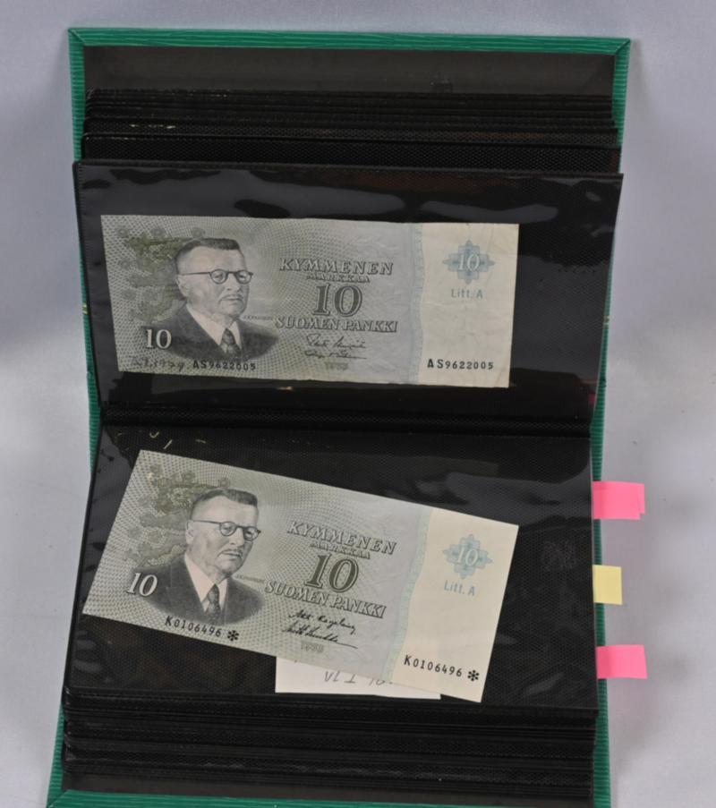 Selection of banknotes in album, over 30 pieces, eg. 1945 500 markka Litt. B, 1945 1000 markka Litt. B, 1975 500 markka etc. In various conditions (Image)