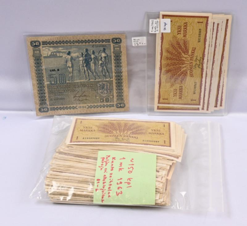 1916 - 1980 selection of 20 fine Finnish banknotes, eg. 1 markka 1916 kv (no 20517004), kl.1, 10 markka 1963 Litt.A set AÅ watermark kl 1+, three mint (0-01/AU) 100 markka 1957 banknotes. Also a big bundle of ca. 150 1 markka banknotes 1963 with plenty of different signature pairs. Interesting lot to study (Image)