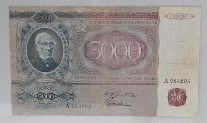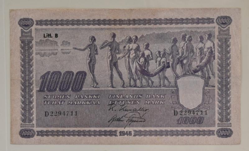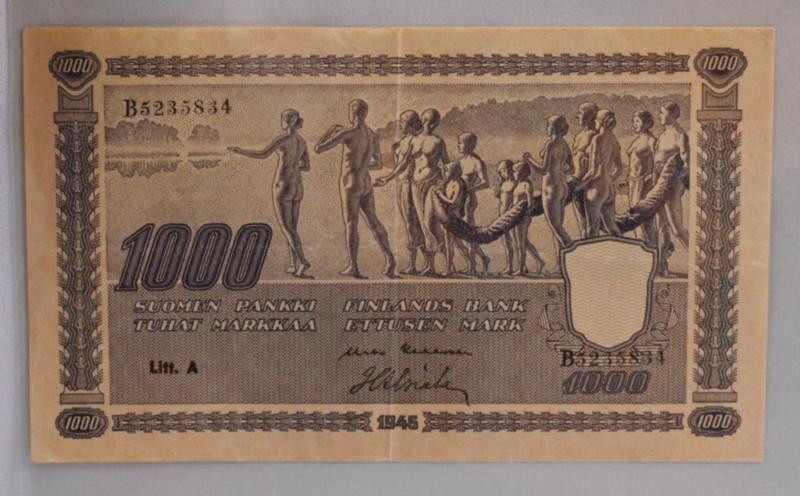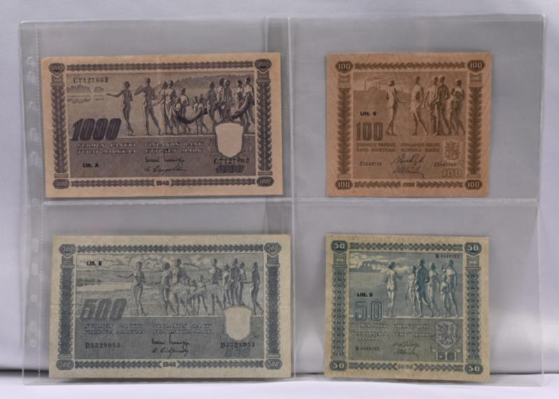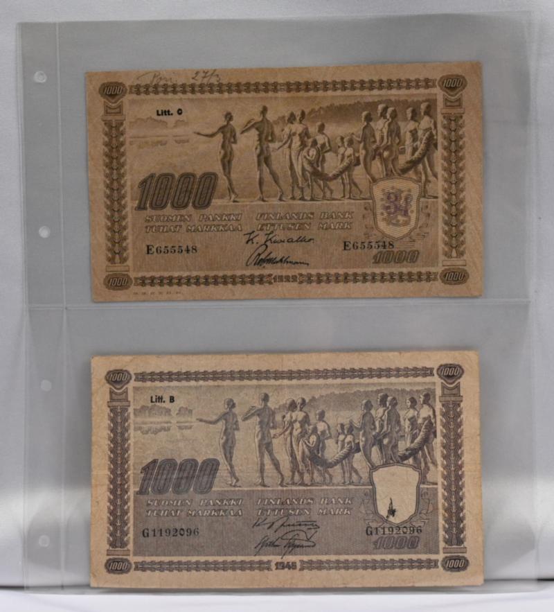 1945 500 markka Litt.B and 1000 markka Litt. A, kl 1. Also 1922 100 markka Litt. C and 1939 50 markka Litt. D, kl 1/1? (Image)
