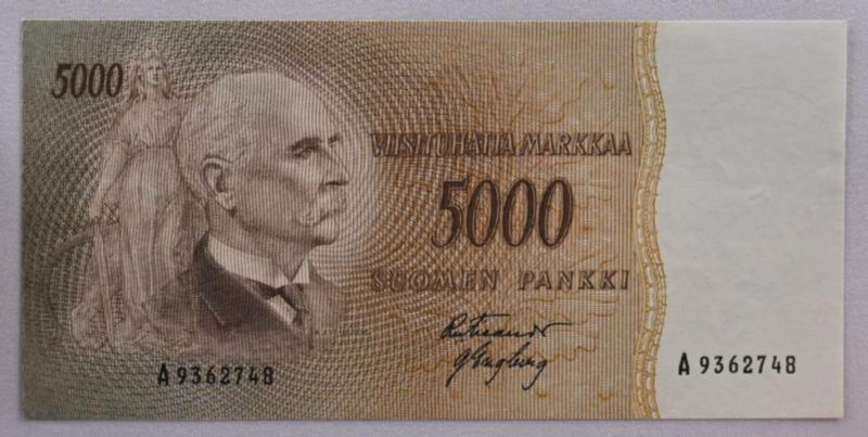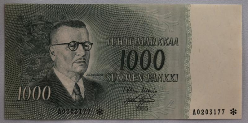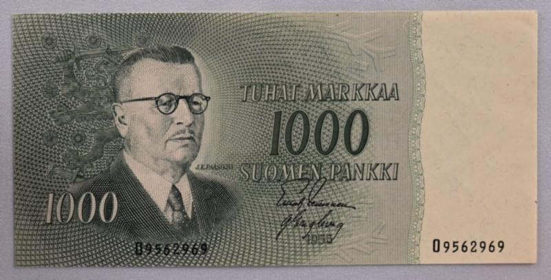 1955 1000 markka star, unbent banknote, but attachment marks on the other side of the banknote (Image)