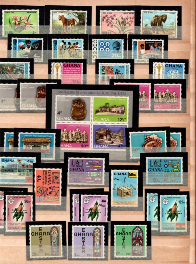 1970-1982. MNH stamp collection Ghana from 1970, including souvenir timesheets and a lot of thematic including imperf sheets material in 1 (A4) stock book.Cata value 1400 Euro. (Image)