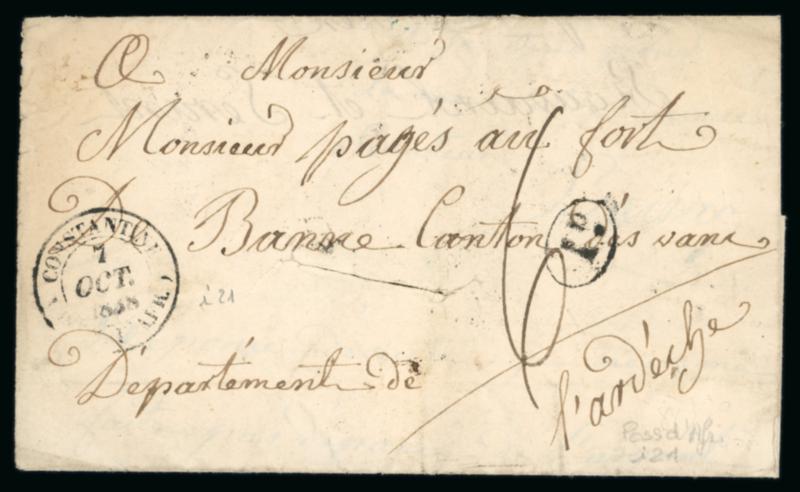 1839, lettre de Constantine à Banne (Ardèche) avec cachet "CONSTANTINE (POSS D'AFR.)" du 7 octobre 1838, ce qui en fait la 1ère date connue, taxe manuscrite 6 + 1 décime de voie de mer, au dos marque en noir "purifié à Toulon" + entailles de purification, cad type 15 au passage à Marseille du 24 octobre 1838 et Nismes le 25 janvier 1839, superbe document. (Image)