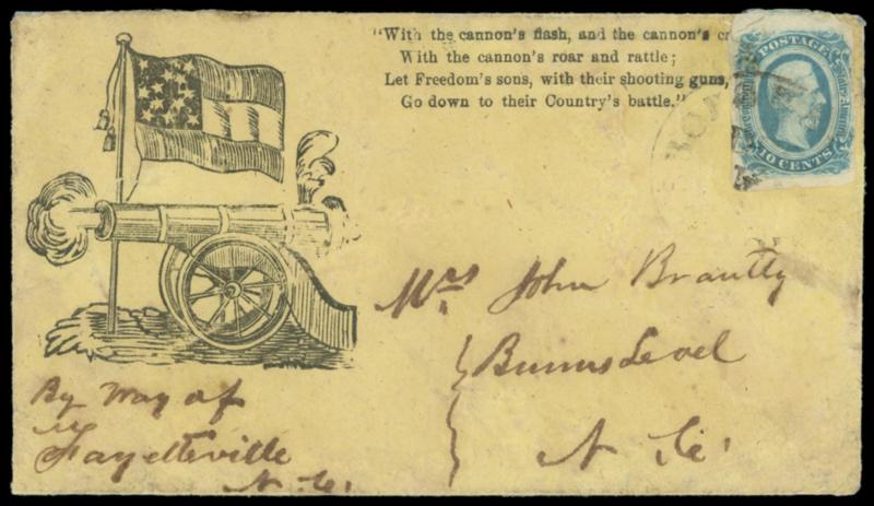 Cannon and 12-Star Flag with Verse. Black design on yellow cover bearing 10¢ blue (12), large margins to clear, tied by partial cds to Burns Level N.C., manuscript "By Way of Fayetteville N.C." at bottom left; professional cleaned and restored, 10¢ small tear, Very Fine appearance,ex-Bush. C.S.A. Catalog No. CN-1C, verse 56; $750. US$0 (Image)