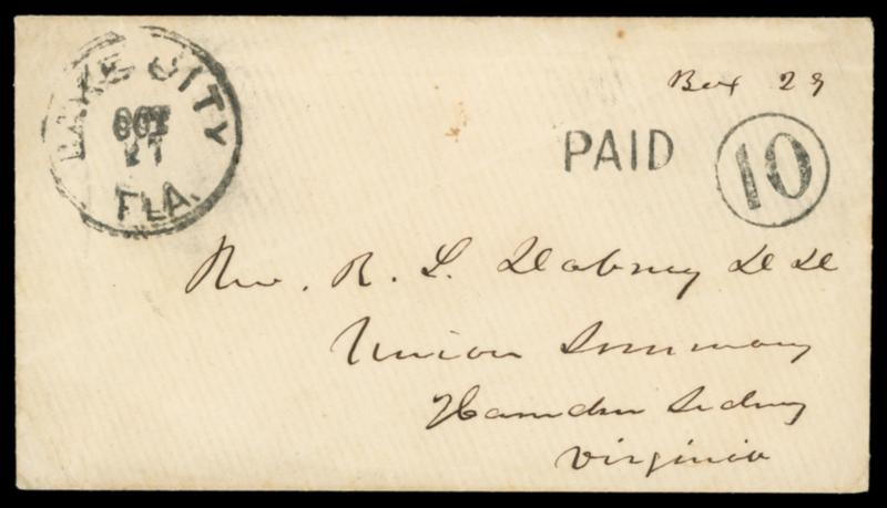 Lake City, Fla. Oct 27. Cds with matching sharp "PAID" and "10" in Circle rating handstamp on cover to Union Seminary, Hampden-Sydney Va., ms. "Box 29" notation top right, Very Fine rating strikes,ex-Briggs. C.S.A. Catalog No. C; $500. US$0 (Image)