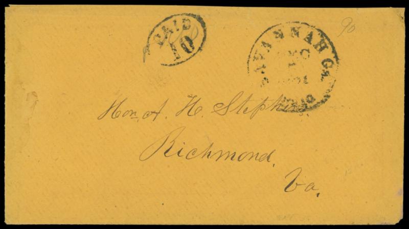 Savannah Ga. Dec 5, 1861. Cds with matching "Paid 10" oval rating handstamp on orange cover addressed to Vice President A.H. Stephens, Richmond Va.; flap missing as usual with interesting content docketing across reverse "J.T. Gaddy Camp Satilla near Waynesville Geo will have from 3 to 4000 men at the above named place & requests Mr. Stephens to have a P.O. established and him appointed Post Master, Refers to Col Kenan"; some edgewear, Very Fine. C.S.A. Catalog No. H; $200. US$0 (Image)