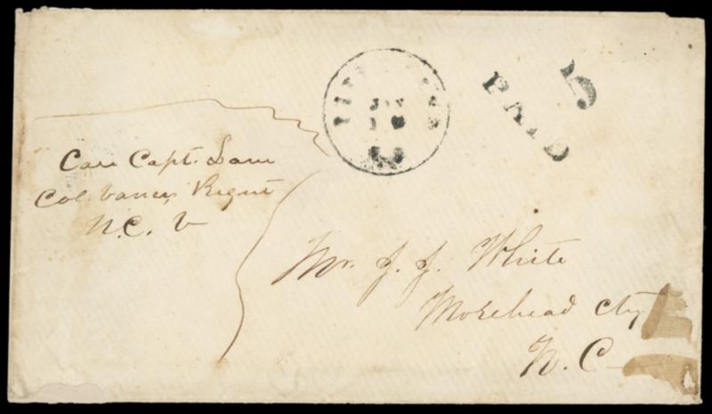 Pittsboro, N.C. Jan 10. Cds with matching "Paid" "5" rating handstamps on circa 1862 cover with military address to J.J. White, Morehead City, N.C. endorsed "Care Capt. Lane, Col. Vance's Regiment N.C.V."; left edge repairs bit of staining, F.-V.F. appearance. C.S.A. Catalog No. B; $200.