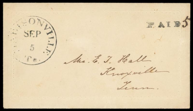 Madisonville Te. Sep 5. Cds with matching "Paid" straightline and ms. "5" rating on circa 1861 embossed lady's envelope to Knoxville Tenn., Very Fine. C.S.A. Catalog No. A; $300. US$0 (Image)