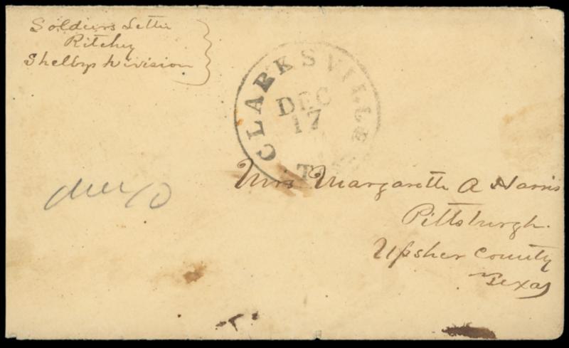 Clarksville, Tex. Dec 17. Cds with pencil "Due 10" rating on yellow cover endorsed "Soldiers Letter, Ritchey, Shelbys Division" to Pittsburgh, Texas; reduced slightly at left, Very Fine,ex-Green, Walske. C.S.A. Catalog No. Ms; $300.