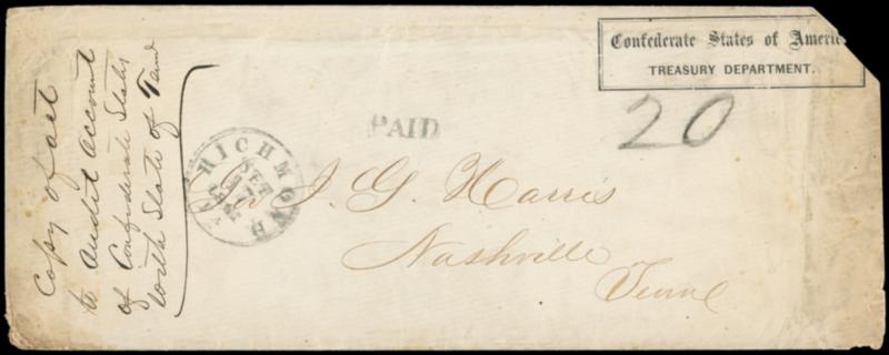 Confederate States of America, Treasury Department. Double-framed semi-official imprint on cover with "Richmond Va. Sep 17, 1861" cds and matching "Paid" with pencil "20" rating to Gov. I.G. Harris, Nashville, Tennessee, docketed "Copy of act to audit account of Confederate States with State of Tenn." at left; upper right corner clipped, Fine. C.S.A. Catalog No. TD-11; $400.