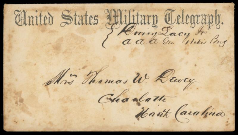 Drury Lacy Jr., A.A.A. Gen Hoke's Brig. Endorsement on "United States Military Telegraph" imprint cover to Mrs. Thomas W. Dewey, Charlotte N.C.; aging, Fine. Estimate; $75 - 100.