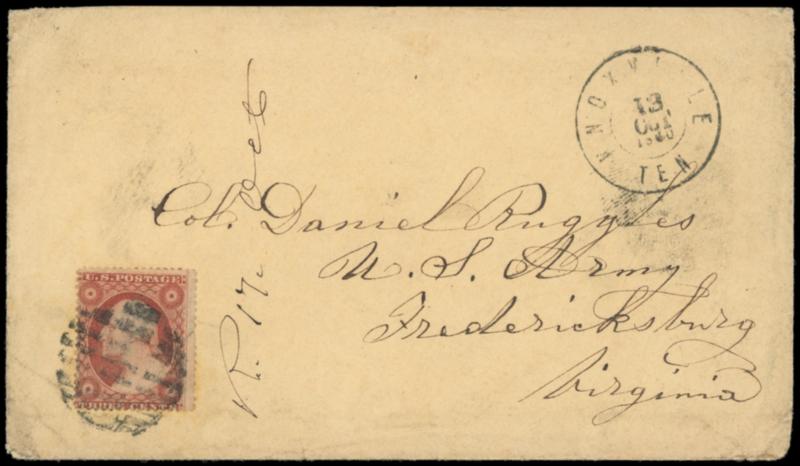 Gen. Daniel Ruggles, CSA. Buff cover bearing 3¢ dull red (26) tied by circular grid, matching "Knoxville, Ten. 13 Oct 1860" cds to Col. Daniel Ruggles, U.S. Army, Fredericksburg, Virginia; docketed "R. 17 Oct" at left, F.-V.F. Estimate; $50 - 75.