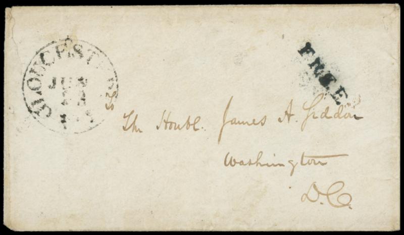 James Alexander Seddon.CSA Secretary of War. Cover with "Gloucester Va., Jun 23" cds and "Free" rating handstamp on pre-war cover to Hon. James A. Siddon, Washington D.C.; couple opening tears, Fine pre-war use as Representative. Estimate; $75 - 100.