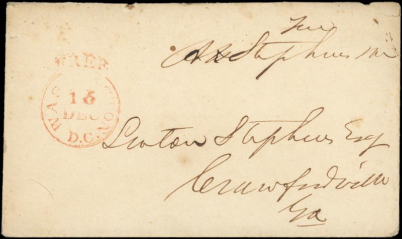 Alexander H. Stephens. Manuscript "Free, Alexander H. Stephens, M.C." free frank on cover with red "Washington D.C., 15 Dec" cds with attached "Free" rating addressed to Linton Stephens, Crawfordsville Ga., 1846 docketing on reverse; flap missing, corner tear, F.-V.F. Estimate; $100 - 150.