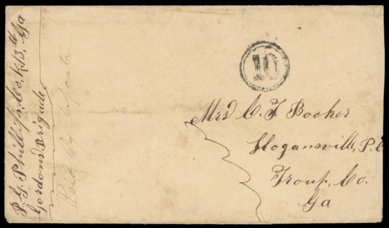 Army of Nothern Virginia "10". Rating handstamp struck on buff cover with left endorsement "P.G. Phillips. Co. K., 13th Ga, Gordons Brigade" to Hogansville Ga., ms. "Paid by Deposta" at left; small edge tear and reduced slightly at right, F.-V.F. C.S.A. Catalog No. ANv-19; Estimate $100 - 150.