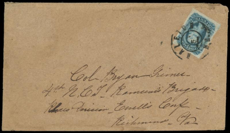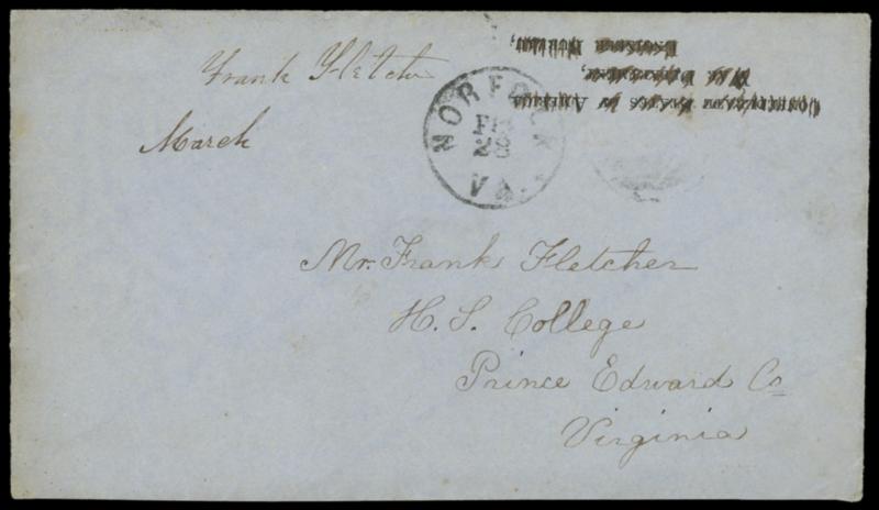 Confederate States of America, War Department, Engineer Bureau. Semi-official imprint crossed out on blue cover with "Norfolk Va. Feb 28" to H.S. College, Prince Edward Co. Va., stamp missing, Fine. Estimate; $50 - 75. US$50-75 (Image)