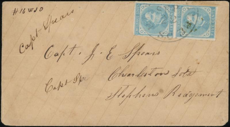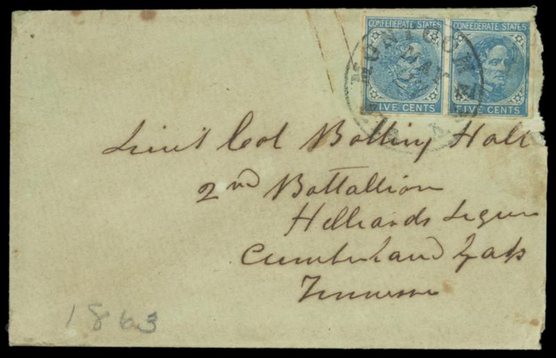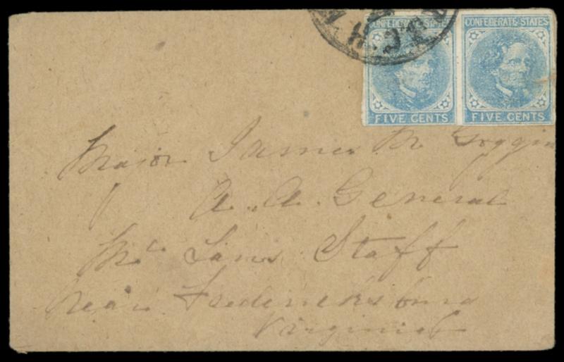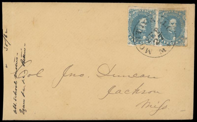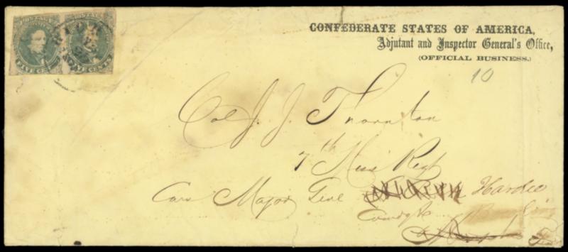 Confederate States of America, Adjutant and Inspector General's Office. Semi-imprint on legal-size lemon cover bearing 5¢ green (1) pair, faults, tied by "Richmond Va. Nov 20, 1861" cds with military address to Col. J.J. Thornton, 7th Miss. Regt., Care Major Genl. Hardee Comdg., Memphis, Tenn.; edge tears, F.-V.F. C.S.A. Catalog No. WD-AG-09; $400.