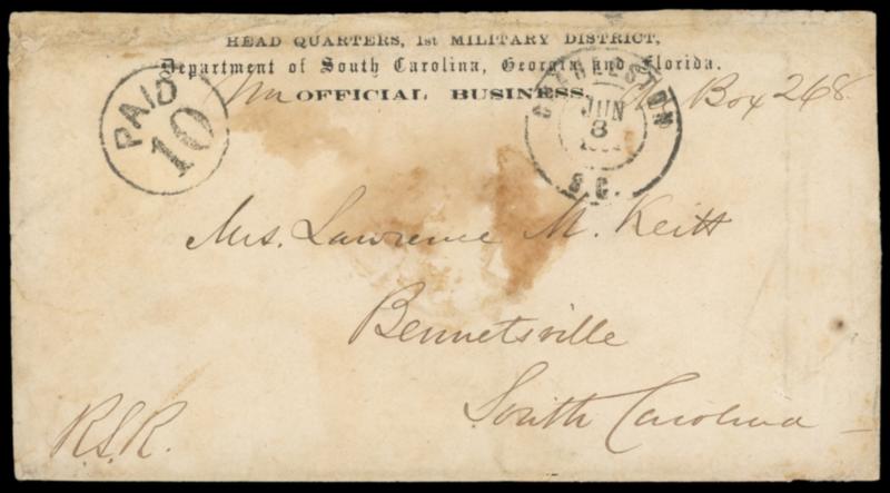 Head Quarters, 1st Military District, Department of South Carolina, Georgia, and Florida, Official Business. Semi-official imprint cover with ms. "Un" in front of "Official" indicating private use, entered mails with "Charleston S.C., Jun 4, 1864" cds with "Paid 10" in Circle rating handstamp addressed to Mrs. Lawrence M. Keith, Bennetsville S.C., included with cover is an unused lettersheet with a variation of the Military Dept. imprint; some staining, Fine. C.S.A. Catalog No. WD-ZA-25; $750.