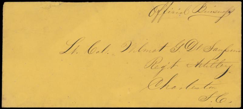 "Official Business" to Gen. Wilmot Gibbes DeSuassure. Manuscript endorsement on legal-size orange cover privately carried to Lt. Col. Wilmot G. De Suassure, Reg't Artillery, Charleston S.C.; small opening tears and part of flap missing, F.-V.F. Estimate; $100 - 150.