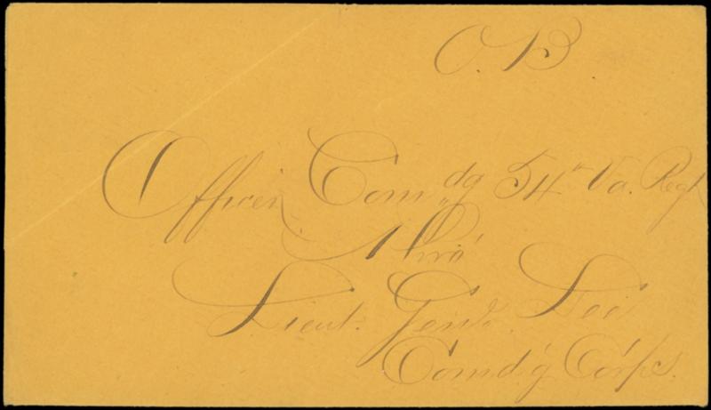 Official Business "O.B." to Gen. Stephen Dill Lee. Orange cover endorsed "O.B." Official Business with military address to Officer Comdg. 54th Va. Regt., Lieut. Genl. Lee, Comdg. Corps; light diagonal crease, still fresh and Very Fine official CSA military use. Estimate; $75 - 100.
