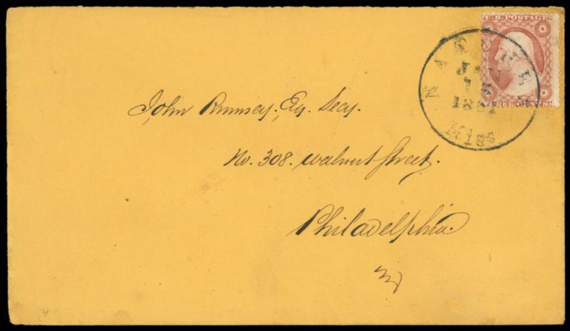 Natchez, Miss., Jan 15, 1861. Cds ties 3¢ dull red (U.S. #26) on orange cover to Philadelphia Pa., Very Fine Independent State use. Scott No. U.S. 26; $325.