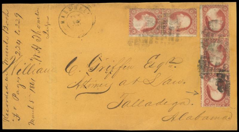 Marshall, Tex. Feb 14, 1861. Cds on buff cover front bearing U.S. 3¢ dull red (26) pair and strip of three, tied by grid cancels to Talladega, Alabama, 1861 docketing, file fold at left, F.-V.F. and scarce Transitional use. Scott No. U.S. 26; $500 as Independent State; Estimate $200 - 300.