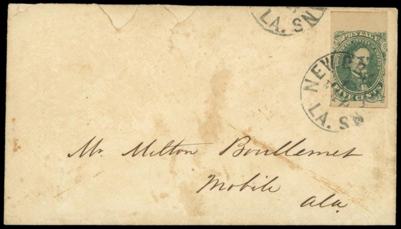 1861, 5¢ green.top sheet margin single, large margins all around, tied by "New Orleans La. 1 Feb" cds on cover to Mobile Ala.; top opening tears, light stains, Fine use with a choice stamp. Scott No. 1; Estimate $150 - 200. US$150-200 (Image)
