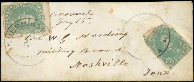1861, 5¢ green. Two irregularly cut singles, each tied by "Fredericksburg Va. 'Paid' Jan 5" cds on cover addressed to Genl. W.G. Harding, Military Board, Nashville, Tenn., "Answered Jay 15"; no flap and part of cover repaired, Fine. Scott No. 1; Estimate $100 - 150.