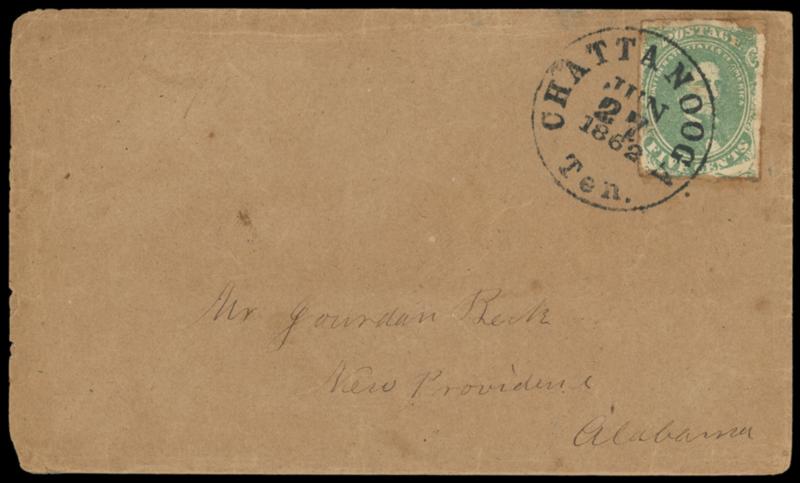 1861, 5¢ green. Full margins but gum stained, tied by sharp "Chattanooga Ten. Jun 27, 1862" cds on brown cover to New Providence Ala., Fine. Scott No. 1; $300. US$0 (Image)
