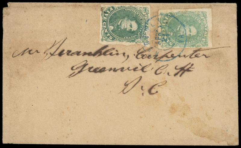 1861, 5¢ green, 5¢ light green, Stone 1. Two four margin singles, tied by blue "Norfolk Va., Apr 21, 1861" cds on homemade buff cover to Greenville C.H., S.C.; dark green with small flaws, F.-V.F. and unusual use. Scott No. 1 var.; $400 + as used singles. US$0 (Image)