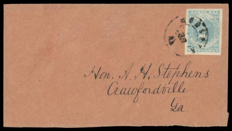 1861, 10¢ blue, Patterson printing. Large even margins, beautiful fresh color, tied by "Augusta Ga., Nov 23" double-circle datestamp on salmon buff cover addressed to Hon. A.H. Stephens, Crawfordville Ga., docketed by the Vice President "N.S. Morse, Augusta Nov. 24, 1862 Publication of Speech" on reverse; no flap as usual, Very Fine. Scott No. 2; Estimate $300 - 400.