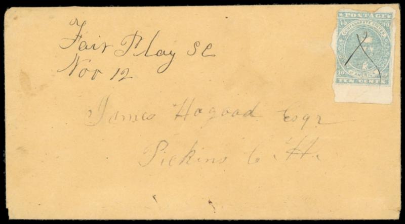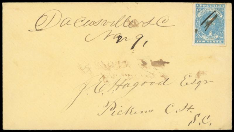 1861, 10¢ blue, Patterson printing. Three large margins, canceled by manuscript, matching "Dacusville S.C., Novr. 9" postmark on buff cover to Pickens C.H., S.C., Very Fine. Scott No. 2; $325. US$0 (Image)