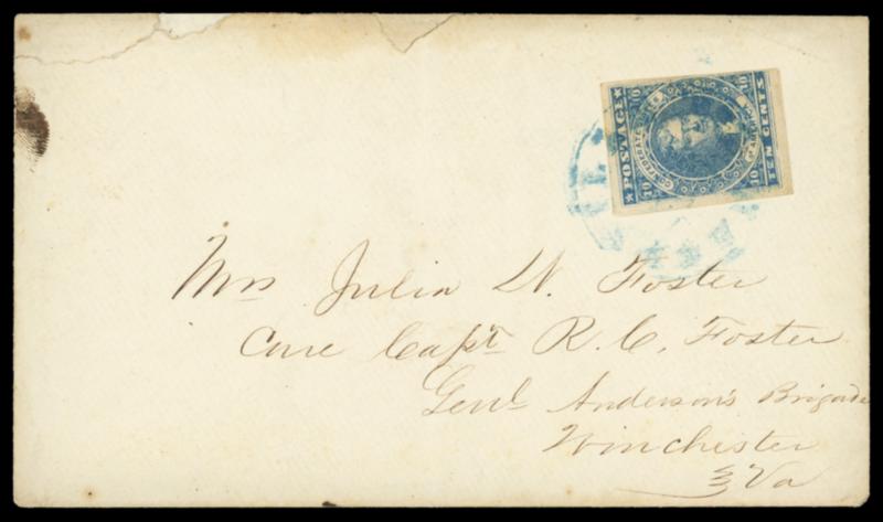 1861, 10¢ blue, Patterson printing. Large margins except touched at right, tied by blue "Nashville Ten. Jan 21" cds on cover with military address care of Capt. R.C. Forster, Genl. Anderson's Brigade, Winchester Va.; opening tears and small edge repair at top, F.-V.F. Scott No. 2; $325.