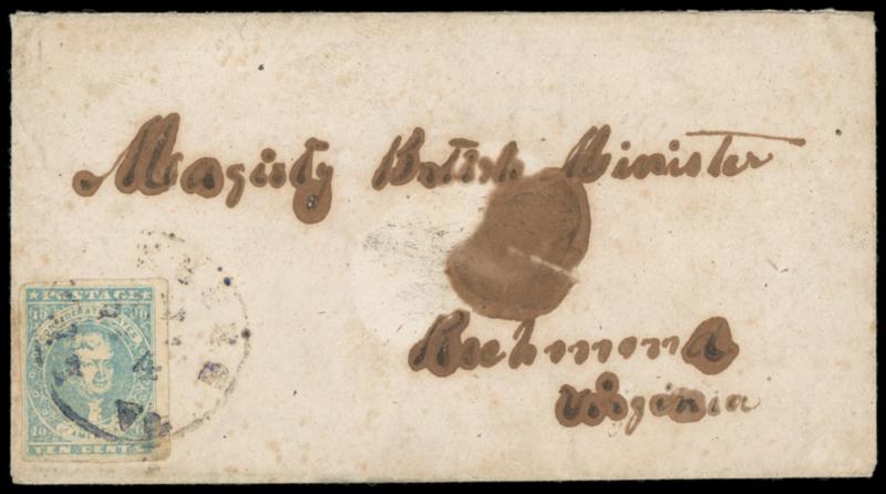 1861, 10¢ blue, Patterson printing. Four margins, tied by partial "Lynchburg Va. Jul 4" cds on cover addressed to the Majesty British Minister, Richmond Va.; messy address with large extra ink spot, Fine and scarce use to the British Minister in the CSA Capitol. Scott No. 2; $325. US$0 (Image)