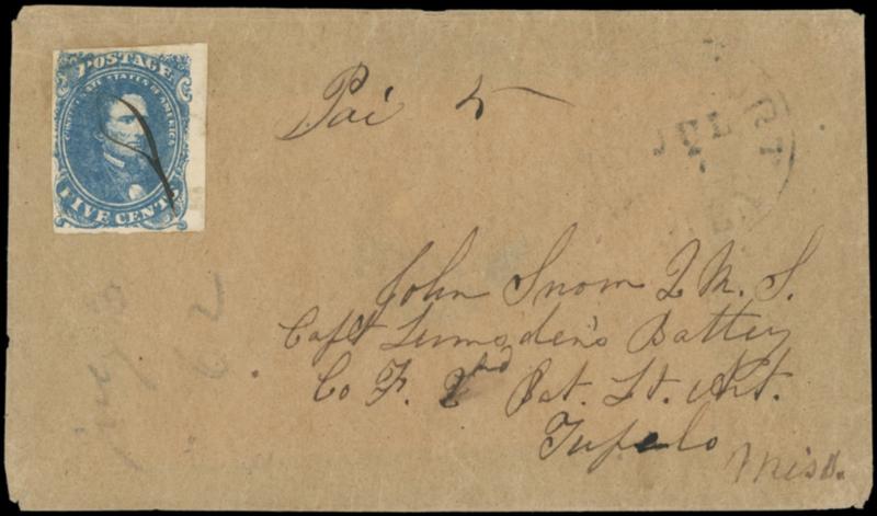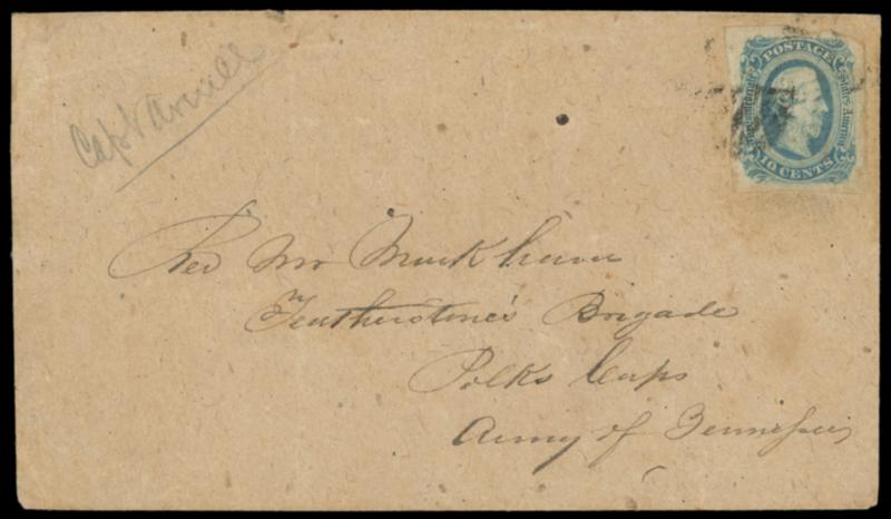 1863, 10¢ blue. Four large margins to closer at top right, tied by circular grid cancel on brown homemade envelope with military address to Rev. Markham, Featherstone's Brigade, Polks Corps, Army of Tennessee, pencil "Capt. Arnell" at top left; small tear top left, Very Fine. Scott No. 11; Estimate $75 - 100.